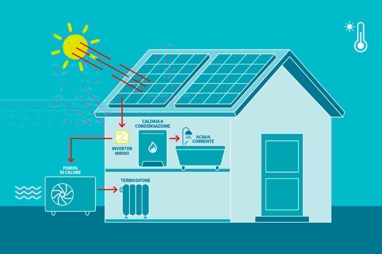 La pompa di calore sfrutta l'energia dell'aria esterna e una piccola quantità di elettricità per riscaldare la casa e produrre acqua calda. Non richiede interventi di ristrutturazione, in quanto si adatta perfettamente ai termosifoni.
